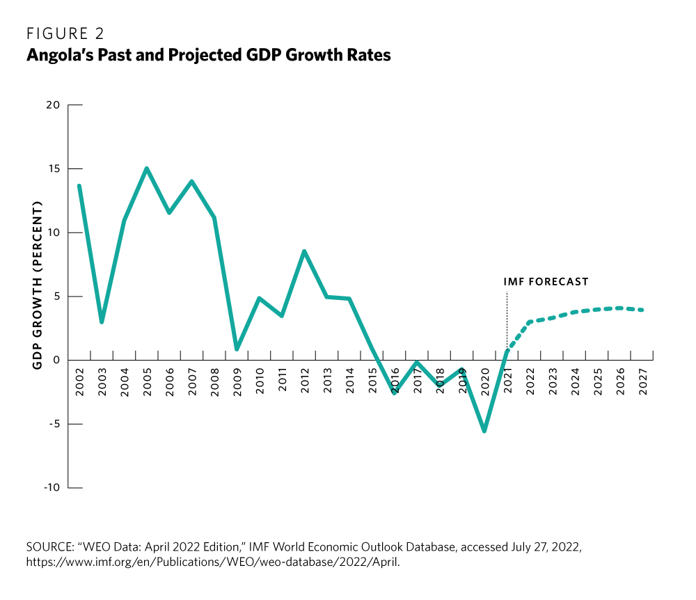 Beyond the cost of servicing Chinese debt, there are questions around the true sustainability of Angola’s public debt. According to IMF analyses, gross domestic product (GDP) growth rates of around 4 percent will be needed to stabilize debt in the medium term. Although this threshold is predicted to be reached by 2025 (see figure 2), the IMF’s track record suggests that this may well be an overestimate. A secular decline in oil production due to maturing oil fields and a lack of new investment casts doubt on the sector’s ability to act as a growth engine. Instead, the 4 percent growth forecast assumes that structural reforms such as the introduction of a flexible exchange rate regime; banking sector regulation, recapitalization, and privatization (including the divestment of Sonangol’s stakes in the Banco Angolano de Investimentos and the full privatization of the Banco de Comércio e Indústria); improvements in public sector transparency; the creation of a competition authority; and the introduction of an insolvency law will be sufficient to bolster private sector confidence and free up resources to finance economic diversification. If these results do not materialize, an unfavorable medium- to long-term global economic outlook might jeopardize the government’s ability to scrape through as it has so often done in the past.